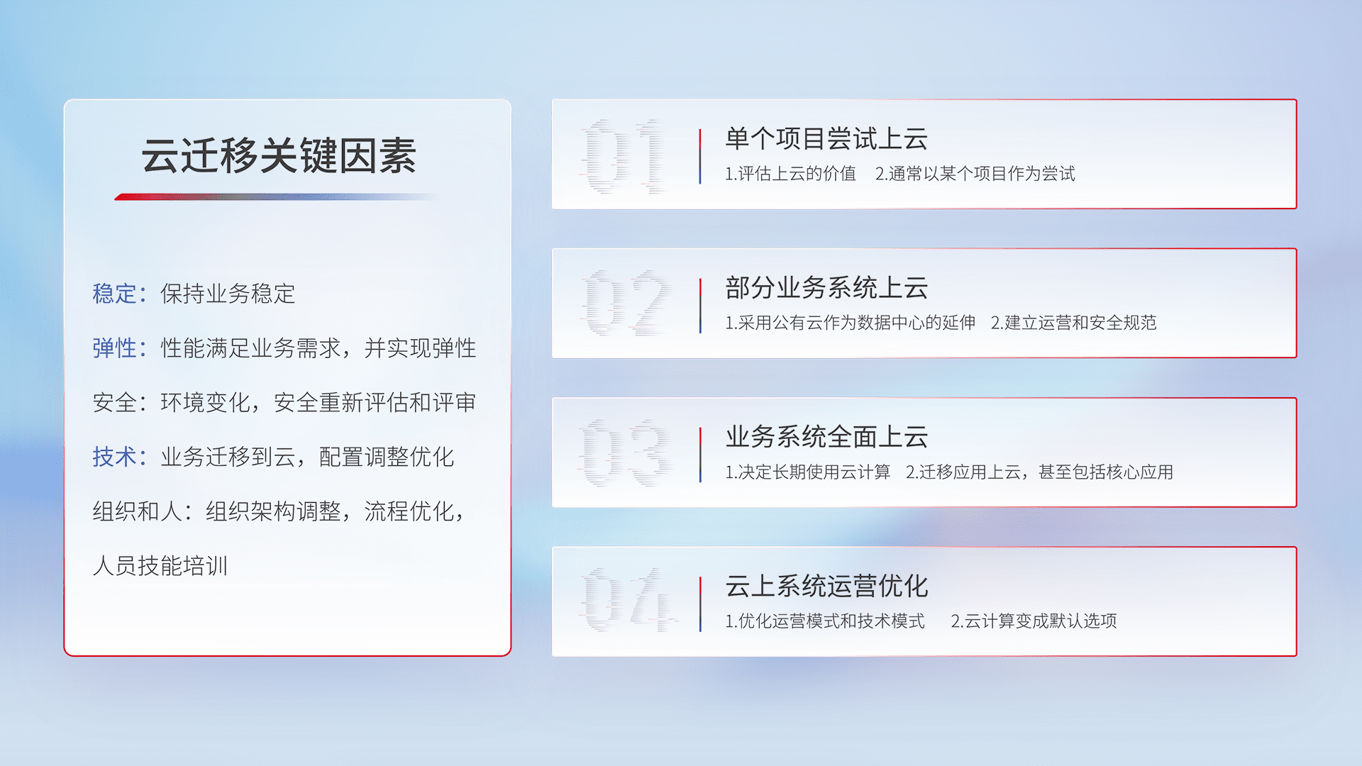 结合实际业务,,,,从规划设计、、、云平台选型、、、云原生改造、、、数据迁移、、、、集成交付,,迁移全过程为客户识别最佳上云路径,,,,做好风险识别管理,,设计网络架构、、、身份权限、、、、安全审计合规、、、操作审计、、、日志审计、、、、监控告警策略、、、多站点容灾设计等,,,对云上基础设施进行整体规划,,,提升IT治理水平,,以满足弹性、、、高可用、、、、高性能的需求。。