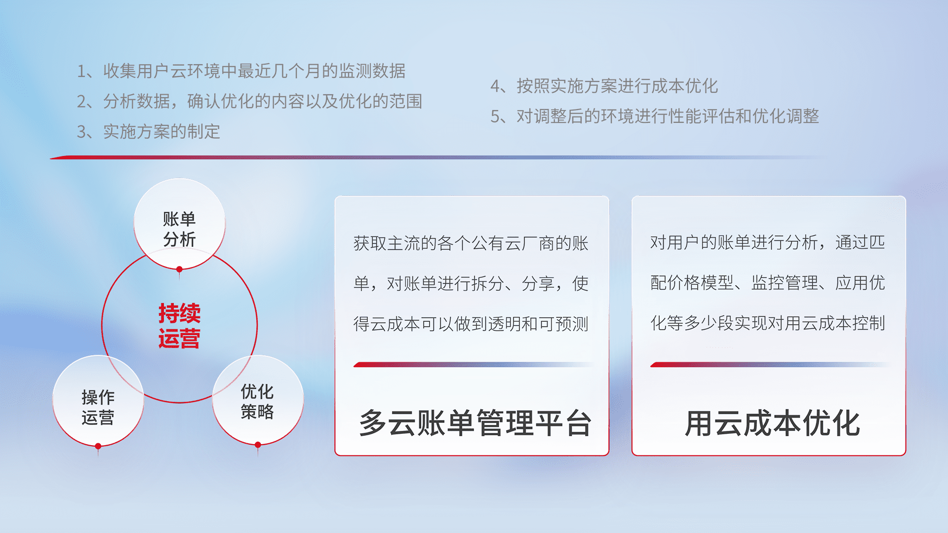 通过多云纳管,,,以统一的资源数据模型把客户的云资源进行抽象和封装,,,,进而实现对多云资源的统一操作,,,保障云资源管理的可靠性、、、稳定性与可用性。。。量身定制化运维内容,,,,配置、、、开发运维、、、、补丁管理、、、、备份、、监控、、、、认证和访问管理、、、审计和日常巡检等,,,保障在用云过程中的可靠度,,稳定度以及高可用率。。。。