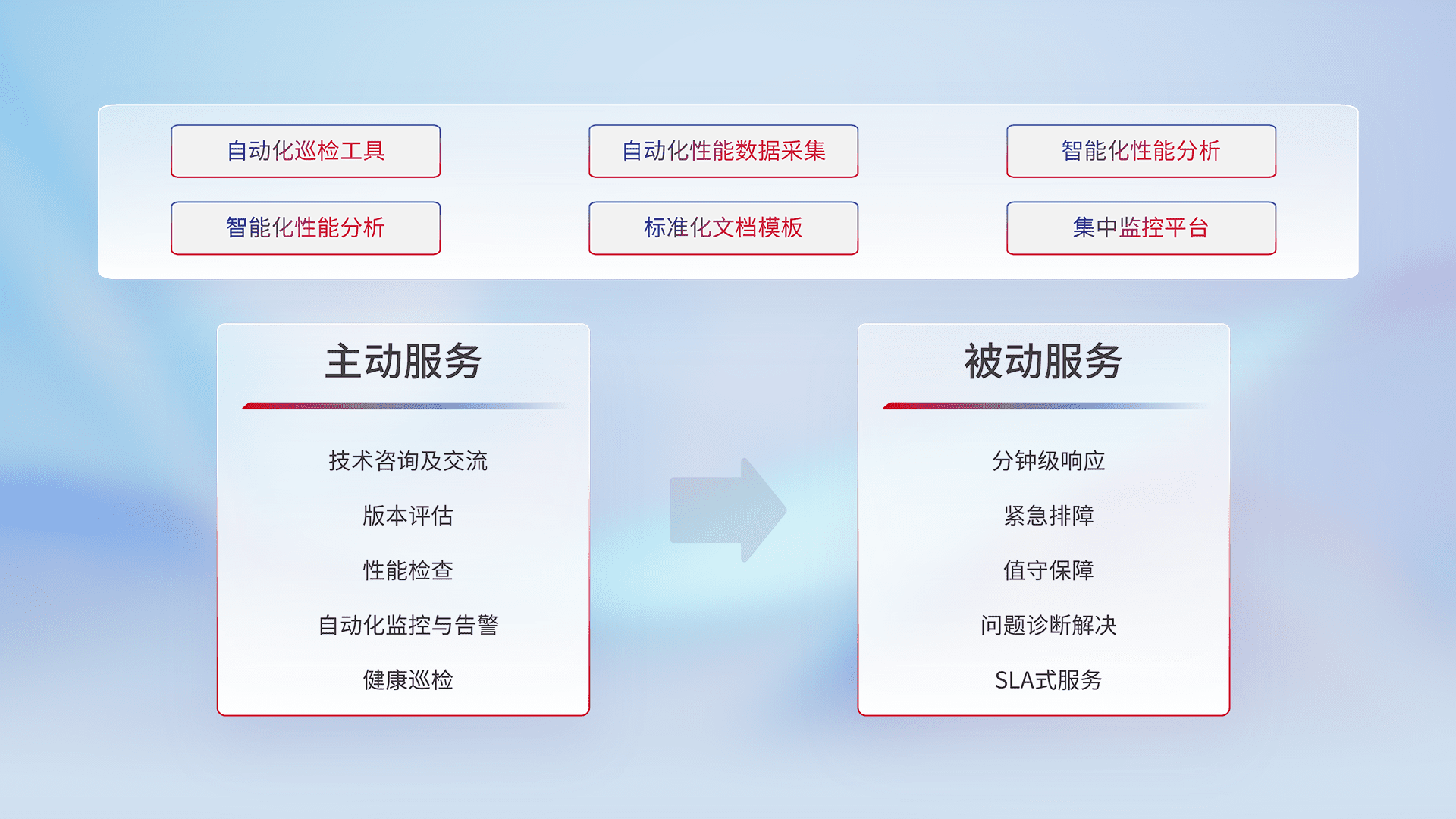 智能化工具和标准化文档,,保障服务质量,,,提供主动服务(包含技术咨询、、、、版本评估、、、性能检查、、、、自动化监控与告警、、、健康巡检)和被动服务包含(分钟级响应、、、紧急排障、、值守保障、、、问题诊断解决、、SLA服务)。。。。